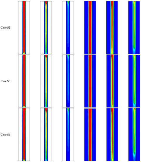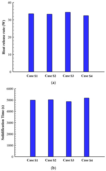 Figure 6a,b illustrates the heat transfer rate and the total discharge time for all the cases. The figures show that those parameters are in the same range (with the small differences), whereas, the maximum heat release found in case S3 (HTF is in a gravity direction in both channels), which is 34.39 W, and the minimum value found in case S4 (HTF is in the opposite route of the gravity in both channels), which is 32.49 W. The solidification time in case S3 registered 4873 s, which is lower than the time of the solidification in cases S1, S2, and S4 by 2.7%, 3.4%, and 6.1%, respectively. The only reason that causes these tiny differences is that the flow in the gravity direction gains energy due to the gravity force, and this energy increases the velocity of the HTF downward, consequently enhancing the heat transfer coefficient, then more heat transfers. In case S4, the HTF flows against the gravity, which slightly decreases the velocity of the fluid causing dropping with a tiny value in the heat transfer coefficient.