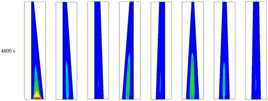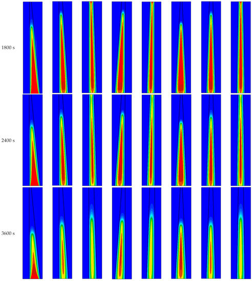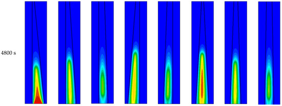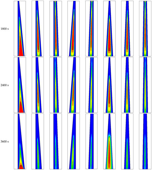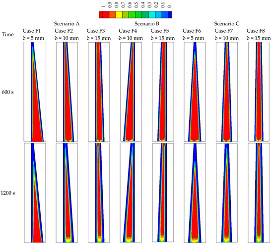 Figure 7 shows the liquid-fraction inhalation contours at five different periods of solidification (600, 1200, 2400, 3600, and 4800 s) for the aforementioned scenarios. The convection heat transfer dominates the heat exchanging process initially for (t = 600 s) due to the liquid state of the PCM in the unit. The PCM solidifies at the adjacent areas to the wall, and there are no major differences between the cases. Note that eight cases are studied using frustum tubes called cases F1 to F8. The solidification process expands gradually at (t = 1200 s) due to the heat conduction, which in turn accelerates the discharging process in the upper region of the PCM unit. In addition, the higher temperature differences between the HTF and the PCM in that area play a role to enhance the phase change process. Due to the various densities between the cold and the warm PCM, the solid PCM sink to the bottom part of the domain. In the meantime, the solid part does not collect at the top of the domain, as shown in all the cases in Figure 7. Within 2400 s, the solid part expands more against the liquid PCM, which is shrinking as illustrated through the red zones of the images, especially at the bottom sections. This is caused by the thermal conduction, which launches to dominate the convection heat transfer during the solidification. This leads the solidification process to become faster at the period of 3600 s. During the last period of the discharging process (t = 4800 s), the solid part cover most of the domains except the middle of the bottom section, due to the far distance from the wall (the PCM domain is wider at the bottom than the top section) on the hand and frozen upper part which has a narrow distance between the two walls. However, cases F3, F5, and F8 have almost total solidification due to the relatively narrow distance between the walls at the bottom section. Therefore, the outcome implies that applying a larger gap leads to a smaller lilt angle of the cooling wall, which provides an improved ability to release more heat from the PCM, consequently resulting in faster solidification.