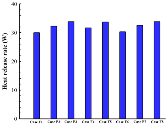 Figure 9 shows the heat release rate for cases F1–F8 at the time of the full solidification state. The figure shows that cases F3, F5, and F8 are the most efficient cases among the others, and case F3 has the highest value. The aforementioned cases have longer width (δ = 15) at the top, making the ratio of the top to the bottom width higher than in the other cases. Reducing this ratio reduces the heat release during the discharge time because of the wide-area at the bottom side, which delays the phase change process at the center of the system. Case F3 has a higher value of the heat release rate with 33.88 W, which is higher than the lowest case (case F1), case F5, and case F8 by 11.5%, 0.3%, and 0.09%, respectively as shown in Table 4. The best configuration among the studied cases in this section regarding the discharging time and heat release is case F3.
