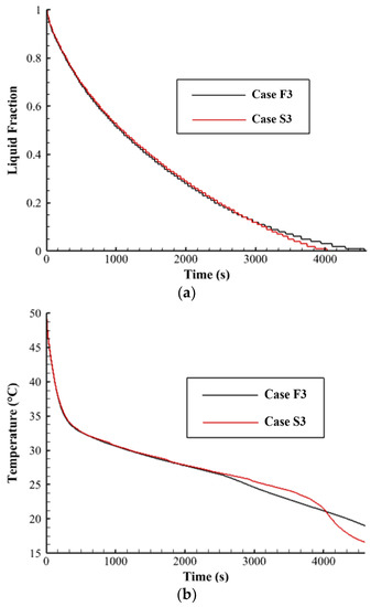 The time-wise difference of (a) liquid-fraction and (b) mean temperature for the PCM discharging for cases S3 and F3.
