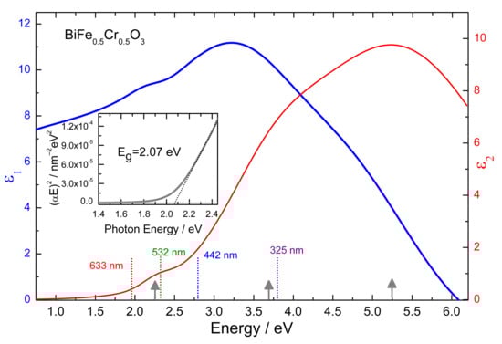 Using the proportionality and extrapolating to zero absorption, a value of the energy gap Eg of 2.07 eV was obtained, as can be seen in the inset of Figure 1. This value is well below the values of the direct optical gaps of 2.8 eV or 2.95 eV reported for BiFeO3 [,] and BiCrO3 [], respectively. The bandgap value obtained is, however, in good agreement with the values determined for Bi2FeCrO6 films which were found to be strongly influenced by the deposition conditions, cation ordering, domain size, or film thickness [,,,,,,].