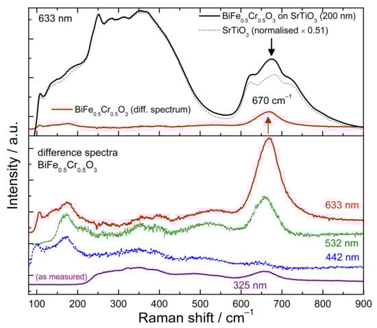 The structure of BiFe0.5Cr0.5O3 is composed of alternating ABO3-AB’O3 perovskite cells (also called as double-perovskite structure A2BB’O6). Structural studies using XRD and neutron diffraction showed that at room temperature BiFe0.5Cr0.5O3 has a trigonal lattice of the space group R3c (No. 161) very similar to that of the BiFeO3 [,]. In the case of BiFeO3, for this space group, group theory predicts 4A1 and 9E polar Raman modes [,,]. The Raman spectrum of a 200 nm thick BiFe0.5Cr0.5O3 film deposited on the SrTiO3 substrate measured with an excitation of 633 nm is shown by the continuous line in the upper part of Figure 3. The Raman signal is dominated by the broad peaks of the substrate. In order to extract the BiFe0.5Cr0.5O3 signal, the substrate spectrum (dotted line in Figure 3) was measured by focusing the laser at a depth of about 30 µm below the film surface, and subsequently subtracted from the film/substrate spectrum. The difference spectrum is shown by the red line in the upper part of Figure 3. As can be seen, besides some weak peaks below 600 cm−1, there is a prominent peak at 670 cm−1. This peak was attributed in a previous Raman study of BiFe0.5Cr0.5O3 films to the SrTiO3 substrate due to its proximity to the substrate peak []. As can be seen in the lower panel of Figure 3, the 670 cm−1 peak is also present in the difference spectrum obtained with the 532 nm and nearly absent in the case of 442 nm excitation line, using the same procedure of subtraction for these excitations. Such a strong intensity dependence on the excitation wavelength is a clear indication of coupling phenomena.