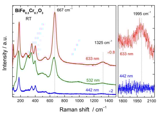For x = 0.7, 0.6, and 0.5 the Raman spectra are resembling more to those of BiFeO3, indicating the expected R3c space group. On the other hand, for x = 0.3 and 0.4 the spectra are more BiCrO3-like (C2/c space group) []. The relative intensity of the 660–670 cm−1 mode in respect to the polar mode (A1LO-ELO) at 172 cm−1 (BiFeO3-like) [] or to the Ag mode at 185 cm−1 (BiCrO3-like) [] is strongest for the highest Fe-Cr mixture (x = 0.4, 0.5, and 0.6). This fact corroborated to the absence of the peak in the case of BiFeO3 and BiCrO3 indicate that the origin of the peak is related to the simultaneous presence of Fe and Cr in the structure. A very similar peak, at similar positions, has been measured also for other perovskite systems with Fe/Cr intermixing. For example, for HoFe1-xCrxO3 a peak at 670 cm−1 was attributed to oxygen breathing mode (Ag-like) and was found to be activated due to the charge transfer between Fe3+ and Cr3+ ions (mediated by O2−) playing a role in electron–phonon coupling []. As for our system, the mode was absent or having a very low intensity for the stoichiometry with only Fe or only Cr. Fe-Cr charge transfer effects activated a similar oxygen vibration mode related to the octahedron breathing in the case of LaFe0.5Cr0.5O3 [] or LaFexCr1−xO3 systems [,] where the mode again vanished in the case of the parent compounds. All these aspects also indicate that in the case of BiFexCr1−xO3 the 670 cm−1 mode is an oxygen-related mode activated by the charge transfer between the Fe and Cr ion, mediated by the excitation light and is strongest when the energy of the incident photons is close to the first absorption peak at 2.27 eV (corresponding to charge transfer excitation between Cr and Fe). This was observed in case of our BiFe0.5Cr0.5O3 films, where the intensity of the 670 cm−1 peak was higher for 633 nm and 532 nm than for 442 nm excitation. Raman spectra for the BiFe0.3Cr0.7O3 polycrystalline sample measured with the same excitation lines are shown in Figure 5. Additionally, in this case the strongest peak at 667 cm−1 is measured when exciting with 633 nm and 532 nm. Moreover, the second order of this peak at 1325 cm−1 and even the third order at ~1995 cm−1 are observable for these two excitations (the third order peak for 532 nm is not shown due to the coincidence with some CCD artefacts), while for 442 nm even the first order is very low in intensity. A very similar behaviour was also observed for the other stoichiometries of the polycrystalline BiFexCr1−xO3 samples.