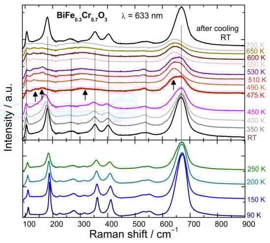 The temperature dependent Raman spectra of BiFe0.3Cr0.7O3 polycrystalline sample in the 90–700 K temperature range are shown in Figure 6. With increasing the temperature up to 450 K the Raman peaks below 600 cm−1 are decreasing in intensity, shifting to lower wavenumbers and become broader, which is a characteristic thermal behaviour related to anharmonicity of the phonon vibrations. However, the position and the broadening of the mode at 670 cm−1 are much less affected by the temperature. This fact could be another indication that the activation of the mode is related to the Fe-Cr charge transfer. Starting with 475 K some new peaks are developing as indicated by the arrows in Figure 6, while peaks corresponding to the lower temperatures (vertical lines) are disappearing. Such a behaviour points to a structural phase transition. The new peaks which develop above 475 K are also present in the spectra measured at 700 K. After subsequent cooling at room temperature the same spectrum as before heating is obtained, indicating that the phase transition is reversible. In the case of BiCrO3, Raman spectroscopy revealed a reversible phase transition from C2/c monoclinic phase to a pnma orthorhombic phase above 400 K []. For BiFe0.3Cr0.7O3 the transition temperature increases. Syncrotron X-ray powder diffraction (SXRD) data indicates a pbam symmetry (PbZrO3-type) at room temperature while at 600 K the structure changes to pnma symmetry of GdFeO3-type (see Figure S2 in Supplementary Materials). The refined lattice parameters obtained from the Rietveld analysis method of the SXRD data by means of RIETAN-2000 program [], indicate that the phase transition is accompanied by a reduction in the volume of the unit cell by a factor of two.