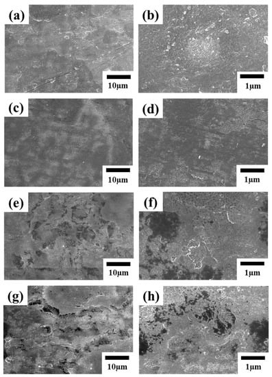 Surface morphology of LZ91 Mg alloy after acid pickling pretreatment for (a,b) 30 s, (c,d) 60 s, (e,f) 90 s, and (g,h) 120 s.