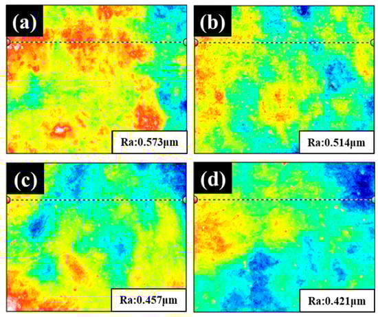 The surface roughness results for 3D white light interferometry are shown in Figure 3. The SEM images show that the surface is similar to a 3D white light diagram, with an average surface roughness between 0.573 μm and 0.421 μm. The roughness decreases when the specimen is immersed for more than 30 s because the β phase corrodes more quickly because the α phase corrodes more slowly than the β phase at different rates [19,34,47]. Figure 2c,d show obvious filament corrosion. As the immersion time increases to 90 s and 120 s, the surface becomes rougher because the β phase continues to corrode. There is a lower roughness after immersion for 90 s and 120 s because of the different corrosion rates, so there is less lithium β phase.