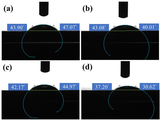 The contact angle for LZ91 Mg alloy after acid pickling pretreatment for (a) 30 s, (b) 60 s, (c) 90 s, and (d) 120 s.