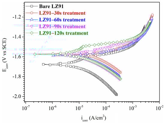 Potentiodynamic polarization curves for bare LZ91 and samples that undergo acid pickling pretreatment in 3.5 wt.% NaCl solution for different times.