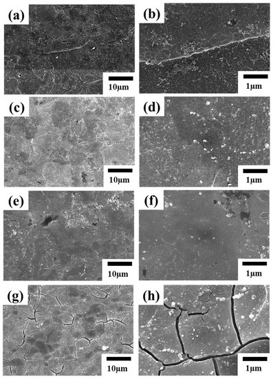 Surface morphology of LZ91 Mg alloy after conversion coating treatment for (a,b) 1 s, (c,d) 5 s, (e,f) 10 s, and (g,h) 30 s.