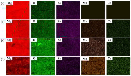 Conversion coating involves a chemical or electrochemical process for which magnesium metal is dissolved and reacted with ions in acidic or alkaline solutions, and insoluble compounds are deposited on the magnesium surface to protect the substrate [20,21,22]. The composition of coatings includes magnesium hydroxides and metal oxides. The oxide-coated surface acts as a barrier layer to prevent aggressive media from diffusing into the substrate and accordingly increases the corrosion resistance of the material. Hexavalent chromium conversion coatings are widely used in industry, but they are harmful to the environment and the human body, so a RoHS (restriction of hazardous substances) directive means that many countries have banned hexavalent chromium and other conversion coating treatments, such as phosphate [23,24,25], manganate [26,27], Stannate [28,29] and rare earth salts [30,31,32].