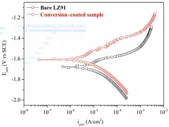 Potentiodynamic polarization curves for bare LZ91 and the conversion-coated sample using 3.5 wt.% NaCl solution.