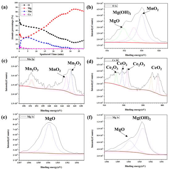 The XPS spectrum for the conversion coating after immersion for 30 s was shown in Figure 10. In Figure 10a, the depth profile shows the element distribution in the Mn-Ce conversion coating during the etching of Ar+. The coating layer is composed of Mn, Ce, O, and Mg. This image shows that as the depth of the test piece increases, there is less manganese and oxygen, and the magnesium content increases. Ce only exists on the surface of the specimens. The XPS spectra for O 1s are shown in Figure 10b. There are three peaks at binding energies of 530.0, 530.9, and 532.1, corresponding to MnO2, Mg(OH)2, and MgO. Figure 10c shows that the high-resolution spectrum for Mn 2p can be deconvoluted into four peaks for Mn2O3 and MnO2, with a binding energy of 641.2, 642.6, 653.4, and 653.7 [19,50]. The Ce 3d peak is deconvoluted into five peaks at 882.3, 885.8, 898.3, 900.8, and 903.9 eV, as shown in Figure 10d, attributed to CeO2 and Ce2O3 [51]. The inner and outer conversion coatings contain two different types of Mg 1s at XPS. The outer Mg 1s peak is at 1303.9 eV, which is MgO, but the inner Mg 1s peak has two peaks at 1302.7 and 1303.9 eV, respectively, corresponding to Mg(OH)2 and MgO [19].