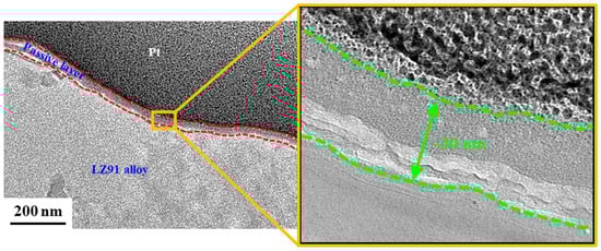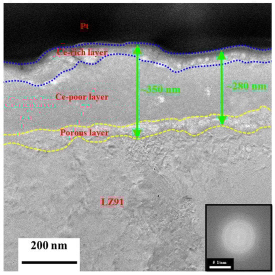 Figure 11 shows the cross-sectional TEM image for LZ91 Mg alloy after immersion in the Mn-Ce conversion coating for 30 s. This conversion coating has a double layer in the structure of LZ91 Mg alloy, which includes a relatively dense layer and a porous layer in contact with the LZ91 Mg substrate. The relatively dense layer also has Ce-rich and Ce-poor regions, consistent with the depth profile analysis for XPS (Figure 10a). The conversion coating is dispersed, and there are nano-voids. These nano-voids evolve when the LZ91 Mg substrate dissolves rapidly in the acidic solution and hydrogen is reduced, so MgO and Mg(OH)2 are formed. The average thickness of the conversion coating is approximately 315 nm. In our previous study [33], the thickness of the porous layer and overall layer (using grinding pretreatment) is between 100 nm and 650 nm, respectively. However, implementing the acid pickling pretreatment, the porous layer is thinner at only 60 nm. The overall thickness is reduced by half (from 650 nm to 315 nm). TEM image showing the cross-sectional morphology of LZ91 Mg alloy after acid pickling pretreatment for 30 s, as shown in Figure 12. It can be clearly found that a uniform passive layer is formed on the surface of LZ91 alloy. The average thickness of the passive layer is approximately 30 nm. Additionally, ICP-OES is used to compare the dissolution of LZ91 alloy after different pretreatment in the conversion coating solution. The dissolved amount of magnesium with grinding pretreatment and acid pickling pretreatment is 0.091 mg/L and 0.032 mg/L in the conversion coating solution, as shown in Table 4. In other words, the passive layer formed by acid pickling pretreatment can inhibit the dissolution of magnesium. This is the main reason for the thinning of the porous layer, which reduces the generation of the hydroxide/oxide layers (MgOH2/MgO).