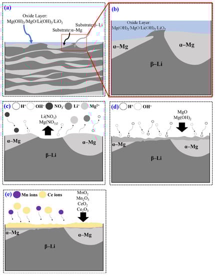 A schematic illustration of (a) initial LZ91 Mg alloy in natural surroundings, (b) partially enlarged image in (a), (c) acid pickling pretreatment, (d) initial immersion in conversion coating solution, and (e) the deposition of Mn-Ce conversion coating on LZ91 Mg alloy.
