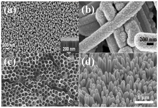 (a) FE-SEM image of nanopyramid shaped TiN thin film synthesized by sputtering process [], reproduced with permission, copyright 2018, Elsevier. (b) Magnified SEM image of rod-like Si60 NWs–TiN electrode [], reproduced with permission, copyright 2021, Elsevier. (c) Mesoporous SEM images of the top surface view of TiN nanotube arrays [], reproduced with permission, copyright 2014, Royal Society of Chemistry. (d) SEM image of the TiN nanowire arrays on the carbon nanotube fibers [], reproduced with permission, copyright 2018, American Chemical Society.