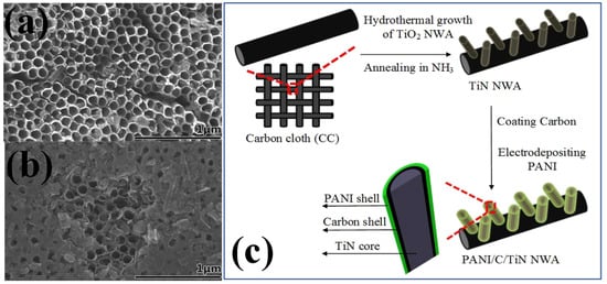(a) The SEM images of the top view of TiN nanotubes and (b) PPy coated TiN nanotubes [], reproduced with permission, copyright 2014, Royal Society of Chemistry. (c) The synthesis mechanism of PANI–C–TiN NWA grown onto CC substrate [], reproduced with permission, copyright 2015, Elsevier.