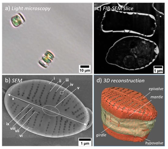 Light microscopy (a), SEM of the external valve view (b), FIB-SEM slice showing cross-sections of two individual cells (c), and 3D reconstruction of the frustule showing valves in red and girdle bands in white (d) of different Gomphonema parvulum cells. Some structural features are illustrated in (b), including: costae (i), striae (ii), a shortened stria (iii), punctate areola covered with a flab-like occlusion (iv), nodule zone (v), striae spacing max (vi)/min (vii), sternum (viii), raphe slit (ix), and the apical axis (x).
