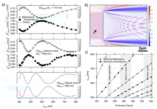 As illustrated in Figure 3a, the λvacc dependency of the reflectance and transmittance intensity of the CSs with thin-slab elements is in good agreement with the discussed trend. However, it should be noted that the extraction of the data points from the complex interference pattern is not trivial. In the case of reflectance, the formation of a seemingly standing wave in the ENorm presentation is caused by the interference of the reflected and the incoming waves (see Figure 3b). This makes the ENorm value strongly position dependent. To overcome this problem, as well as to minimize the edge diffraction effects, we follow the strategy illustrated in Figure S4. Moreover, as the theoretical calculations expect the intensity of the reflectance and transmission, squaring the extracted ENorm values is required to obtain a match between both the shape and magnitude of the reflectance and transmission spectra (Figure S4e,f, respectively). It should be noted that—using the method described in Figure S4—ENorm,R and ENorm,T values associated with the sternum of CSlong,2 are extractable, while this is not the case for the nodule zone due to its finite length (Lnod). Despite this, the expected constructive and destructive maxima of the nodule zone are observed in the simulation results.