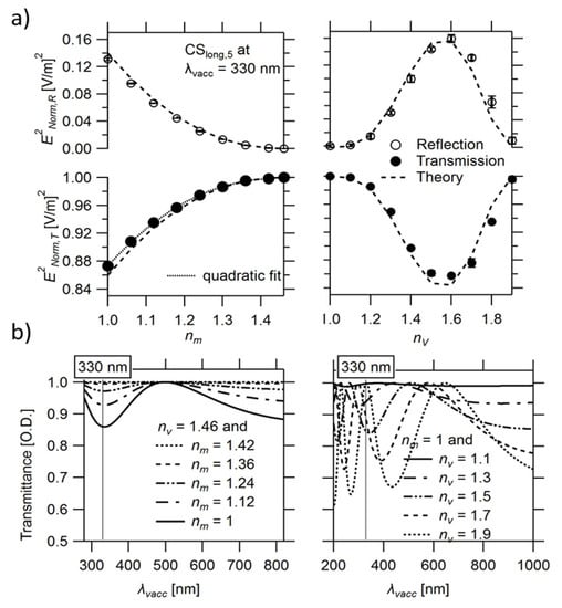 (a) The change of E2Norm (i.e., intensity) of the reflected and transmitted wave by CSlong,5 at λvacc = 330 nm vs. changing nm (left) or nv (right) compared to theoretical calculations. (b) The change of transmission spectra vs. changing nm (left) or nv (right), based on theoretical calculations.