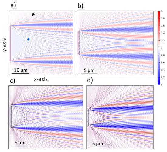A thin slab of 20 µm length (a), Sana,long5 (b), CSlong,5 (c), and CSlong,7 (d) at λvacc = 300 nm in the air. The black and blue arrows in (a) indicate the fringes outside and inside the transmittance region, respectively.