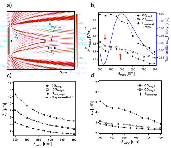 (a) The interference pattern of CSlong,5 at λvacc 300 nm in air and the focusing parameters of interest; the color code emphasizes the focusing spots. (b) The λvacc dependency of the intensity E2Norm,f of selected spots (e.g., the spot illustrated in (a) for CSlong,5) compared to the thin-film interference spectrum of the transmittance expected from theory (blue); the red arrows indicate places where the thin-film interference affects the intensity of the spots. The extracted ENorm,f has an error up to ± 0.02 V/m associated with the local variation in the strength of the selected spot. (c) The λvacc dependency of Zf and (d) Lf of the same selected spots in air.