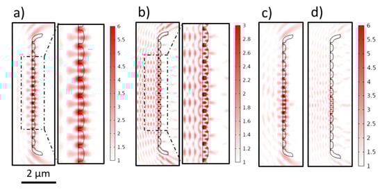 For a specific range of wavelengths, the grid-like element exhibits another phenomenon, guided-mode resonance (GMR), which is widely reported for dielectric resonant gratings and photonic crystals of period d comparable to λvacc [89,90,91]. At a specific combination of various parameters related to the incident light, including λvacc, ϴinc, and polarization, and the grid, including thickness D, pore spacing d, filling factor ff, and its material refractive index n, the grid-coupled GMR can be obtained [90,92,93,94]. It occurs when the grid (considered as an inhomogeneous waveguide) couples the incident wavefront into guided modes, which cannot be sustained within, and leak out [92] to interfere constructively or destructively with the reflectance or transmittance, respectively, leading to the characteristic spectrum of GMR [90]. During GMR, a standing wave pattern is expected inside the grid-like element (e.g., Figure 10), with intense nodes reaching the maximum at the middle of the grid and decaying towards the edges with a simultaneous evanescence in the proximity of the grid surface.