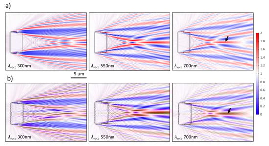 It is expected from the previous work on PJ generation by artificial structures that the characteristic features of the PJ beam (i.a., the position, length, waist size, and maximum intensity) can be changed with changing parameters such as nv, nm, and incident λvacc, as well as the structure size [79,80]. As illustrated in Figure 8e, the maximum intensity of the PJ (ENorm,PJ) generated by CSlong,3/nodule decreases exponentially with increasing λvacc combined with a slight decrease in its distance from CSlong,3/nodule and an increase in its waist size (Figure S10b). Furthermore, changing the refractive index contrast Δn by either varying nv (nm = 1) or nm (nv =1.46), but keeping nv > nm, leads to similar changes in the PJ parameters (Figure S10c vs. Figure S10d). Where the ENorm,PJ increases, its waist size decreases, and the distance to CSlong,3/nodule slightly decreases with increasing Δn. Similar trends were observed by Salhi et al. [79] that the PJ intensity decreases while its waist size increases with increasing λvacc (see Figure 6 in [79]) or reducing Δn (see Figure 5 in [79]).