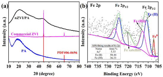 XRD patterns of PA, commercial ZVI, and nZVI/PA composites (a), and high-resolution XPS spectra of nZVI/PA composites (b).