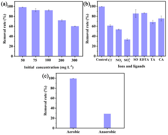 Effect of CIP initial concentration (a), co-existing ions and organic ligands (b), and DO (c) on CIP removal.