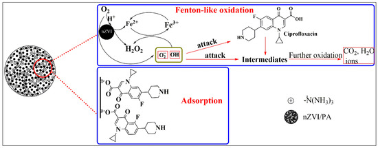 Based on the above and other results, a possible mechanism of nZVI/PA for CIP removal is proposed in Figure 8, which includes Fenton-like oxidation degradation and adsorption. For the oxidation process, firstly, nZVI supported on PA generated ·OH through Fenton-like reaction Equations (8) and (9) and gave a sustained supply of Fe2+ through Equation (10). In addition, electrons of nZVI rapidly consumed oxygen to form through Equations (11)–(13). Eventually, CIP was degraded by through Equation (14). For the adsorption process, the adsorption of CIP on composites was predominately as a result of sharing or exchanging the electrons between the active sites and CIP [70].