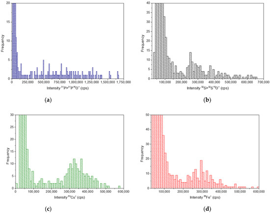 Histograms that show the signal distribution of spleen cells monitoring (a) 31P+ (as 31P16O+), (b) 32S+ (as 32S16O+), (c) 63Cu+ and (d) 56Fe+.