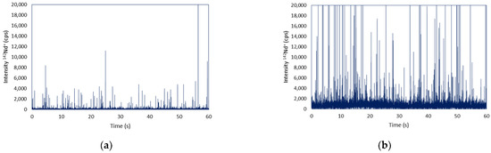 The fixed and washed cell suspensions were directly diluted in ultrapure water and were pumped at 10 µL min−1 to the high efficiency, pneumatic nebulization-based sample introduction system. Figure 3 shows the signals corresponding to P, S, Fe and Cu in spleen cells in the corresponding histograms [25]. Since the ICP-TQ-MS that was used in these studies allows the monitoring of just one isotope at a time, several runs had to be done in order to acquire these data, thus P and S were measured as oxides (31P16O+ and 32S16O+) and 56Fe+ and 63Cu+, on mass.