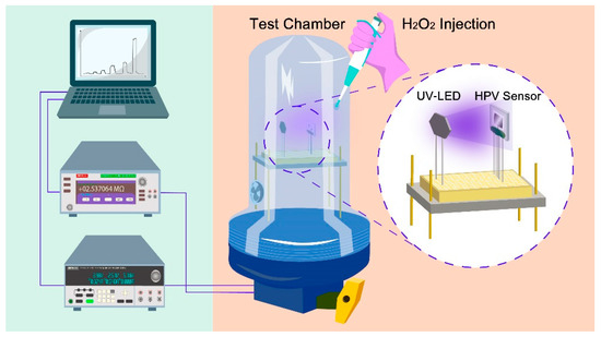 The HPV sensing behavior was investigated using a self-designed gas testing setup including a 2 L gas chamber, a Keithley DMM7510 7 1/2 Digital Multimeter, a Keithley 2231A-30-3 DC Power Supply, a UV LED (λ = 365 nm, with the illumination of 3 mW cm−2), a heater, and an air circulator fan (Figure 3). To obtain the HPV concentration in the gas chamber, a desired amount of the liquid hydrogen peroxide was dropped on the purpose-built evaporating crucible, converting liquid hydrogen peroxide to HPV. The real concentrations of HPV were calculated by considering the percentage of liquid hydrogen peroxide aqueous solution, the amount of dripped drops, and the chamber volume [25]. For the measurements of resistance variation over time, a 3 V DC voltage bias was applied to the IDES, while a bias voltage range of 0–5 V was used for the sensor heater to obtain operating temperatures ranging from 25 to 250 °C.