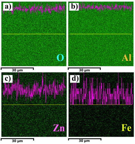 EDX elemental mapping analysis and X-ray intensity of characteristic lines of O (a), Al (b), Zn (c), and Fe (d) elements.