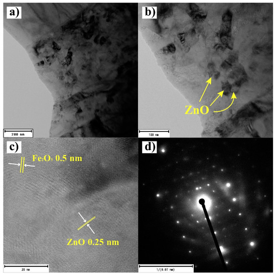 The crystal structure of the Fe2O3:ZnO material was analyzed by TEM, and the results are depicted in Figure 8. The hexagonal shape of ZnO [28], with average particle sizes of 15–30 nm in diameter, was confirmed (Figure 8a,b). The lattice fringes of the Fe2O3 and ZnO materials are clearly visible in the high-resolution TEM (EFTEM Jeol 2200 FS, JEOL Ltd., Tokyo, Japan) image of the Fe2O3:ZnO material (Figure 8c), with the interplanar spacing of 0.5 nm and 0.25 nm, respectively [29]. The selected area electron diffraction (SAED) pattern of the material revealed the nearly polycrystalline structure of the Fe2O3:ZnO material [30].