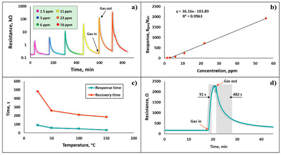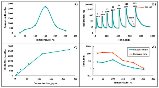 (a) Sensor response vs operating temperature at 225 ppm HPV, (b) dynamic resistance curves of the sensor to the different concentrations of HPV at 150 °C, (c) response vs HPV concentration, (d) dependence of the response and recovery times on the operating temperature.
