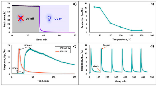 (a) dynamic resistance curves of the sensor to the different concentrations of HPV with UV irradiation, (b) sensor response vs HPV concentration under UV light, (c) dependence of the response and recovery times on the operating temperature under UV light, (d) real-time resistance curve of the sensor at 1.5 ppm HPV, representing the response and recovery time under UV irradiation at RT.