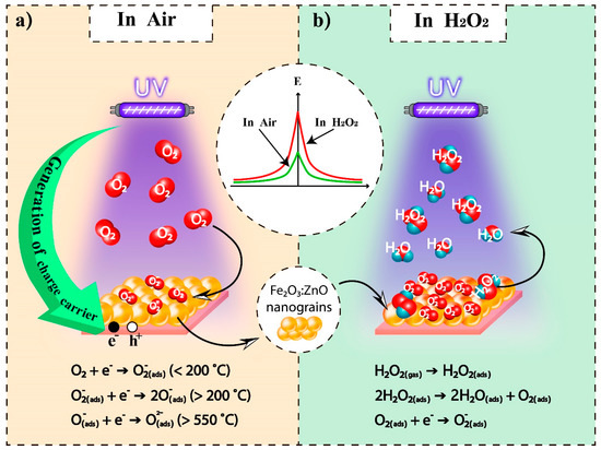 At high temperatures (>200 °C), O− and O2− oxygen species predominate on the sensor surface, whose further participation in the kinetic phenomena leads to a decrease in the sensor response in the presence of UV rays (Figure 10b). At RT (<200 °C), O2− oxygen species play the main role in the gas sensing mechanism of the Fe2O3:ZnO sensor, leading to rather high sensitivity. This was observed because the UV rays not only induced the physisorption of HPV molecules on the Fe2O3:ZnO surface, but also stimulated the chemisorption processes [43].