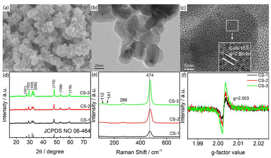 (a–c) SEM, TEM, and HRTEM images of CS-3, respectively. (d) XRD diffraction patterns, (e) Raman spectra, and (f) EPR spectra.