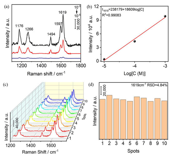 Moreover, SERS performance of CS-3 for sensing MO, a widely used model pollutant to evaluate photocatalytic activity, was also investigated. Figure 4a presents the measured spectra of MO at various concentrations from 1 × 10−3 M to 1 × 10−5 M. There are five characteristic Raman peaks at 1619, 1597, 1494, 1266, and 1176 cm−1. Among them, the two strong SERS bands at 1619 cm−1 and 1597 cm−1 correspond to vibration modes of C=C stretching and bending in the benzene ring, respectively. 1494, 1266, and 1176 cm−1 are associated with the mixed mode of ring C-C stretching and C-H bending, C-N stretching in methyl group, and C-N=N stretching, respectively [50,51]. The intensity of 1619 cm−1 peak can be expressed as with (Figure 4b), indicating good linearity of SERS intensity versus MO concentration. Figure 4c displays10 SERS spectra collected at randomly selected regions, which show similar characteristic bands with comparable intensity. The RSD of 1619 cm−1 peak is 4.84%, indicating good reproducibility of CS-3 sample (Figure 4d). The good detection linearity and reproducibility make CS-3 substrate is suitable for monitoring photocatalytic degradation of MO.
