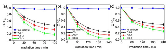 (a–c) Photoreduction of Cr(VI) over CS-1, CS-2, and CS-3 subjected to UV, visible, andNIR light irradiation, respectively.
