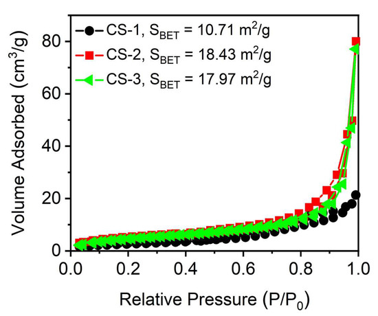 Electrochemical impendence spectra and transient photocurrent response analysis was carried out to explore the influence of sulfur vacancy on the charge carrier transfer and separation, one of the crucial factors determining photocatalytic efficiency [24,52,53,54]. As shown in the Nyquist plots in Figure 8a, CS-3 has the smallest semicircles, implying more effective suppression of photo-excited electrons and holes. Moreover, the photocurrent response follows the order CS-3 > CS-2 > CS-1, suggesting that CS-3 has better separation efficiency of charge carriers (Figure 8b). Based on the results of electrochemical measurements, the creation of sulfur vacancy defects can promote transfer and separation of charge carriers. Similar phenomena have been reported previously such as boosting photocatalytic N2 fixation by creation of oxygen vacancies in TiO2 due to promoted adsorption and charge transfer [55], and improving photocatalytic CO2 reduction efficiency of In2O3 via oxygen vacancies, which could increase reduction potential, suppress carrier recombination, and improve adsorption capability [54]. Since surface area and pore size could affect the accessibility of Cr(VI) to active sites and the catalytic performance, the porosity of CS-1, CS-2, and CS-3 were characterized by nitrogen adsorption—desorption measurements (Figure 9 and Table S1). It can be found that CS-3 has smaller specific surface area (17.97 m2 g−1) than CS-2 (18.43 m2 g−1), indicating that the pore structure does not play a significant role in the improved photocatalytic activity of vacancy-rich CuS.