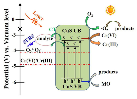 Figure 10 shows schematically the feasible explanation for the enhanced photon-induced charge transfer (CT) and photocatalytic activity associated with sulfur vacancy. According to the literatures [56], the lowest unoccupied molecular orbital (LUMO) and the highest occupied molecular orbital levels of 4-NBT are −2.91 and −7.01 eV, and CuS has the conduction band (CB) and valence band (VB) at −3.67 and −5.99 eV, respectively [57]. Moreover, sulfur vacancy-related energy levels are located below CB minimum [27]. Under the 532 nm laser (2.33 eV) excitation, VB electrons in CuS are directly excited to CB, and subsequently transfer to the LUMO of 4-NBT molecules. In addition, electrons trapped at the vs. defect energy levels can also transfer to the LUMO of 4-NBT, which facilitates the CT process. The transfer of photo-excited charge carriers between target molecules and substrate would magnify Raman scattering cross-section, and consequently, result in enhancement of 4-NBT signal. Similarly, Vs defect energy levels can also promote CT between CuS and MO. The presence of sulfur vacancies can also help to promote photocatalytic activity. Surface vacancies can act as trapping sites of photo-generated charge carriers, which will inhibit charge carrier recombination. As a result, more photo-induced electrons and holes can travel to the surface of catalyst and contribute to catalytic reaction.