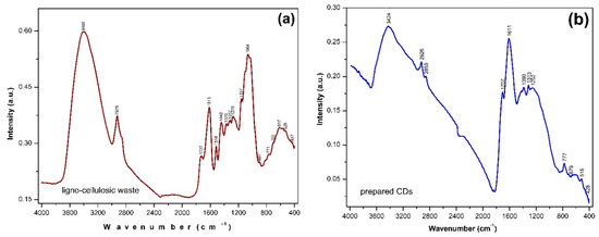 Recorded IR spectra for (a) the ligno−cellulosic waste and (b) the prepared CDs.