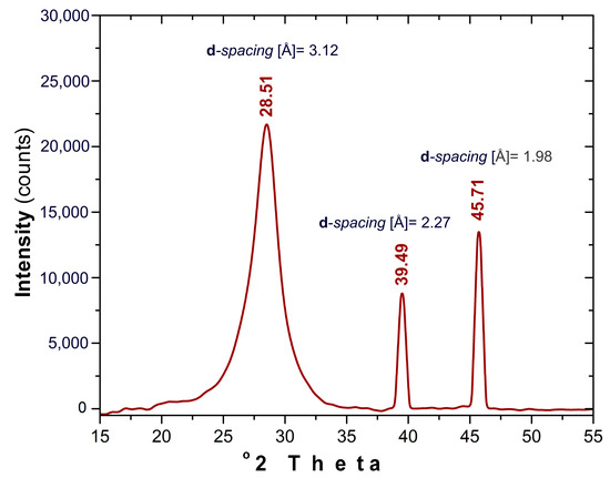 Figure 5 presents the XRD pattern recorded for the prepared CDs. The broad peak located at 28.51° 2θ is typical for graphitic structures [43]. The peak is slightly up-shifted compared with plain graphite peak (26.4° 2θ) corresponding to a minor decrease of the plane spacing between the carbon layers from 3.37 Å to 3.12 Å most probably due to the presence of various atomic species inserted within the graphitic structure as was also suggested by the Raman investigation results. The presence of the narrow peaks located at 39.49 and 45.71° 2θ are a result of the metallic residues (Section 3.1, EDX Investigation) inherently trapped within the graphitic core.