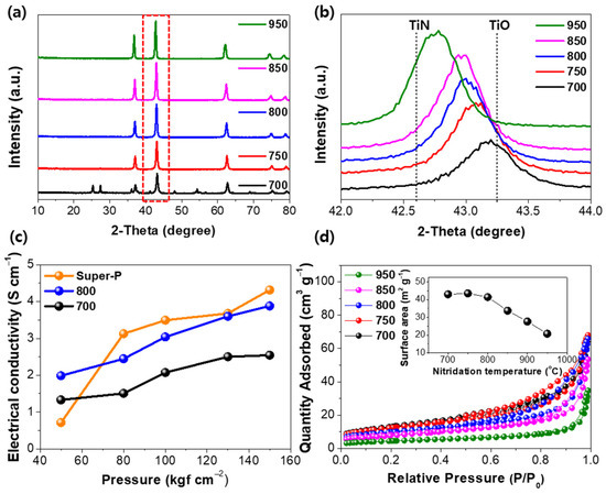 Physicochemical properties of TiON prepared with different nitridation temperatures. (a) XRD patterns and (b) magnified major peaks at 2-theta 42–44°. (c) Electrical conductivity behavior of TiON prepared at different nitridation temperatures as a function of pressure with those of a commercial carbon conductor (super-P). (d) Nitrogen adsorption and desorption isotherms; (Inset) surface area depends on the nitridation temperature of TiO2.