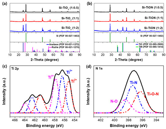 XRD patterns of (a) Si-TiO2 prepared by the spray-drying process and (b) subsequently nitrided Si-TiON composite with ratios of 1:0.5, 1:1, and 1:2. (c,d) X-ray photoelectron spectra for Si-TiON (1:1) composite in the region of binding energies of Ti 2p and N 1s core levels.