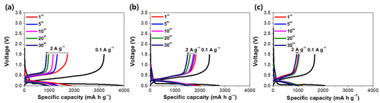 Voltage profiles for first and selected subsequent cycles at 0.1 A g−1 and 2 A g−1, respectively: (a) Si NPs, (b) Si-TiON (1:0.5), and (c) Si-TiON (1:1).