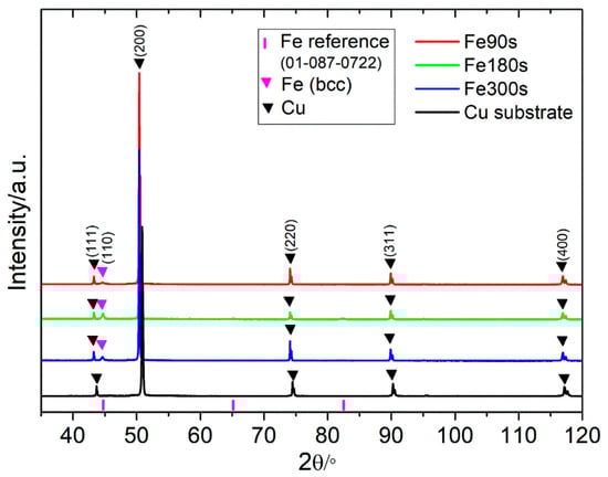 The XRD diffractograms of the substrate and the as-deposited samples are displayed in Figure 1. The samples show all peaks of Cu with an additional peak of bcc Fe (110) (denoted by the pink triangle). The peak positions of Cu have been shifted to the left as a result of layers of deposited Fe, which increased the overall thickness of the sample. On the other hand, peaks of Fe maintain their position since their position is always the same, i.e., on top of the sample. Other iron peaks are not clearly visible; only the most intense peak is seen, probably because the deposition layer was too thin. Additionally, there are no peaks attributable to iron oxides. Based on these results, it is clear that mainly metallic Fe has been deposited on the copper substrate.