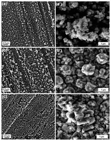SEM images of the top surface of (a) Fe90s, (b) Fe180s, and (c) Fe300s with their corresponding highly magnified images in (a’–c’).